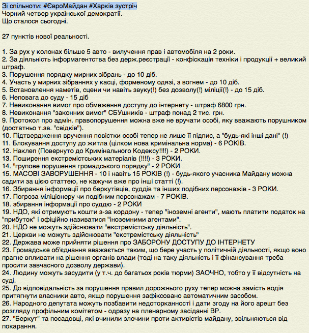 Дык я и почитал (то был просто перепост "эмоций" с Майдану). Там вообще половины муссируемых "законов" нет, а вторая половина на стадии законопроектов. Реально приняты только некоторые. Смотрим раздел "Сообщения" и "Законопроекты". Разводят хомячков, как всегда...