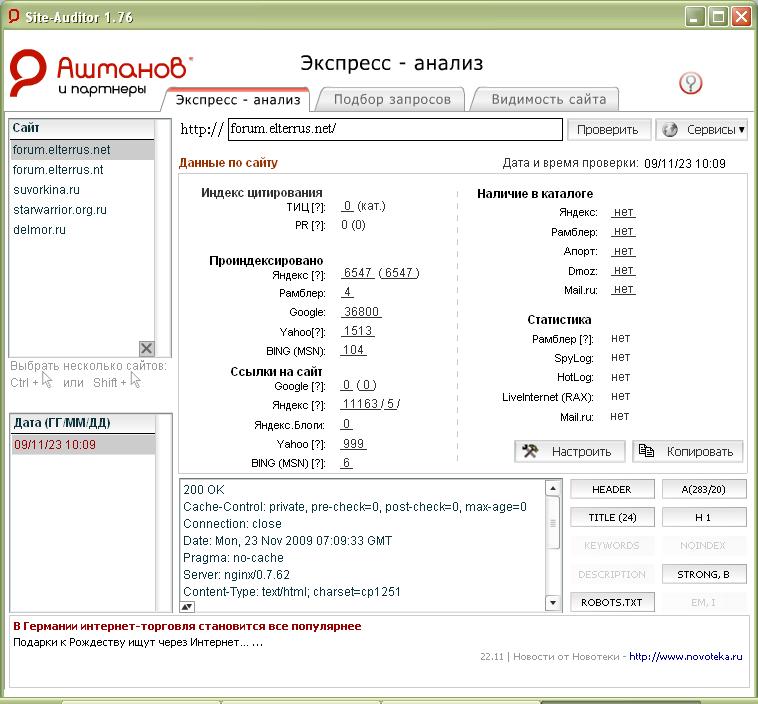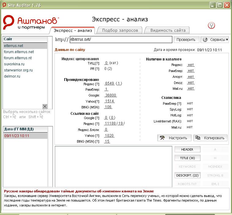 Далее, смотрим статистику, особо обращая внимание на пункты ТИЦ и PR (первый отвечает за яндекс, второй - за гугл):