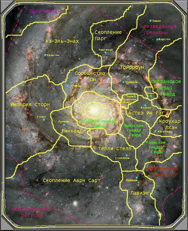 Третий вопрос, в продолжении первого на карте не указано местоположение Фарсена (кстати нет к нему и эмблемы, как и к Керсиалю). В книге написано что ближайшими соседями Фарсена являются: "Трирроун", "Скопление Парг" и "Севанское Гнездо Гвард". Значит ли это, что Фарсен распологается на территории Трирроуна?
