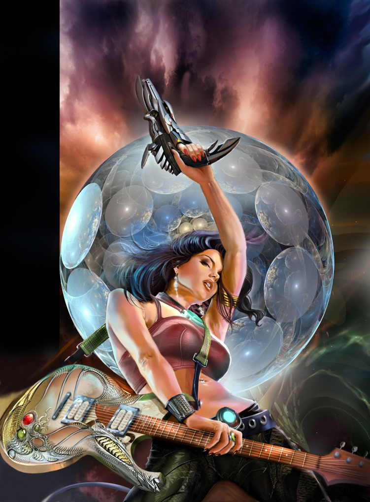 За основу этот рисунок взять можно. Только гитару сделать бы еще более "хищной", Элька пусть глаза не закрывает и томно не жмурится, а смотрит прямо на зрителя. И псевдопистолет нужно чем-то заменить, хотя бы фаерболом.